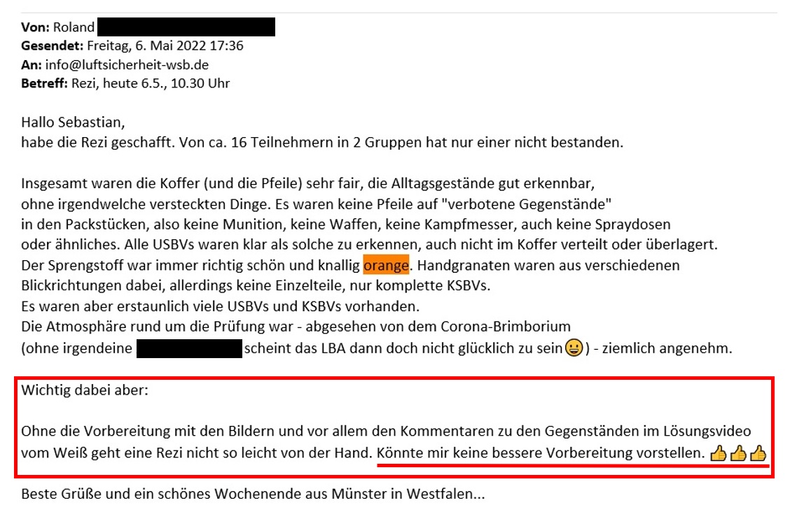 "Ich muss zugeben, Hr. Weiß spricht in seiner Weiterbildung für Luftsicherheitskontrollkräfte Fracht fachliche Sachverhalte und Begriffe an, die absolut Praxis relevant sind, von denen ich jedoch noch nie etwas gehört habe.